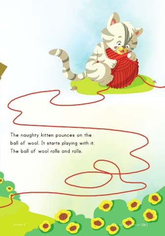 The naughty kitten pounces on the ball of wool. It starts playing with it. The ball of wool rolls and rolls.