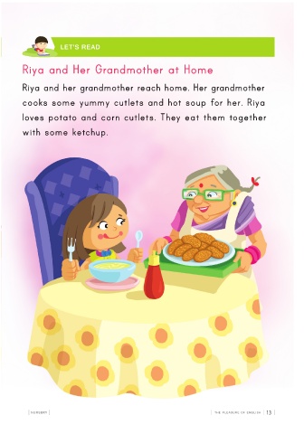 Riya and Her Grandmother at Home Riya and her grandmother reach home. Her grandmother cooks some yummy cutlets and hot soup for her. Riya loves potato and corn cutlets. They eat them together with some ketchup.
