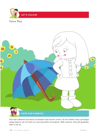 Colour Riya. This task enhances eye-hand coordination and muscle control. As the children have just begun using crayons, do not insist on colouring within boundaries. With practice, they will gradually learn to do so.