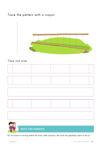Trace the pattern with a crayon. Trace and write. Do not insist on writing within the lines. With practice, the child will gradually learn to do so.