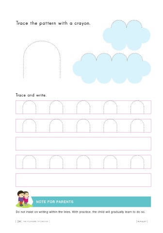 Trace the pattern with a crayon. Trace and write. Do not insist on writing within the lines. With practice, the child will gradually learn to do so. 34