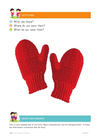 1 What are these? 2 Where do you wear them? 3 When do you wear them? This is a pre-reading task for the story ‘Riya’s Grandmother and the Naughty Kitten’. It helps the child build a connection with the story.