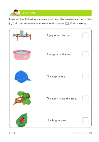 Look at the following pictures and read the sentences. Put a tick ( ) if the sentence is correct and a cross ( ) if it is wrong. X ü A jug is on the cot. A mug is in the tub. The cap is red. The nest is on the tree. The bug is pink. LKG 19