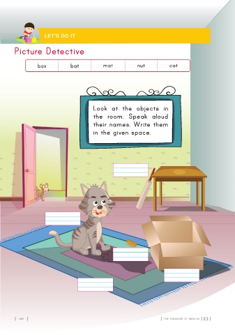 Picture Detective box bat mat nut cat Look at the objects in the room. Speak aloud their names. Write them in the given space. LKG 23