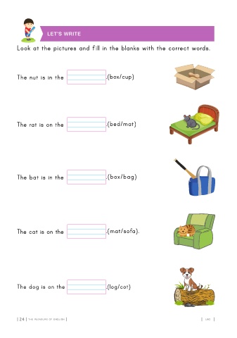 Look at the pictures and fill in the blanks with the correct words. The nut is in the .(box/cup) The rat is on the .(bed/mat) The bat is in the .(box/bag) The cat is on the .(mat/sofa). The dog is on the .(log/cot) 24 LKG